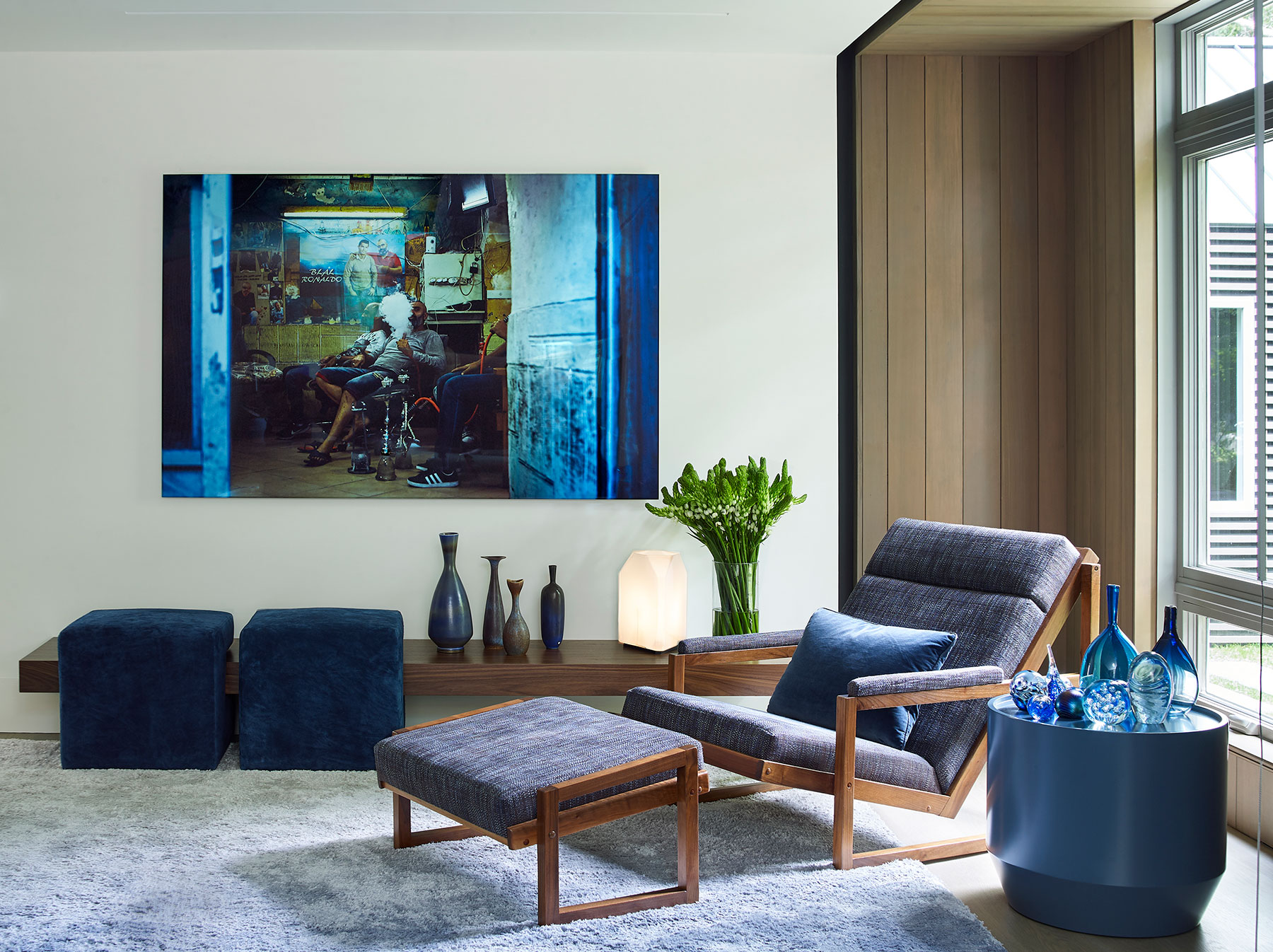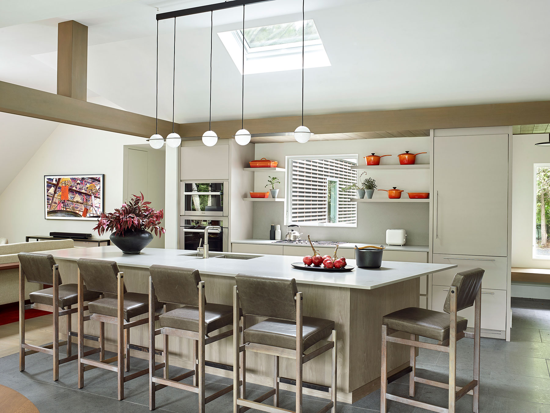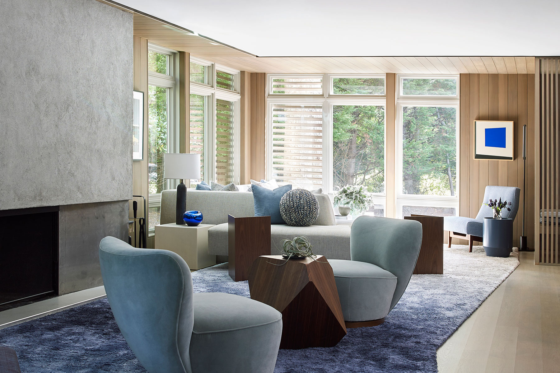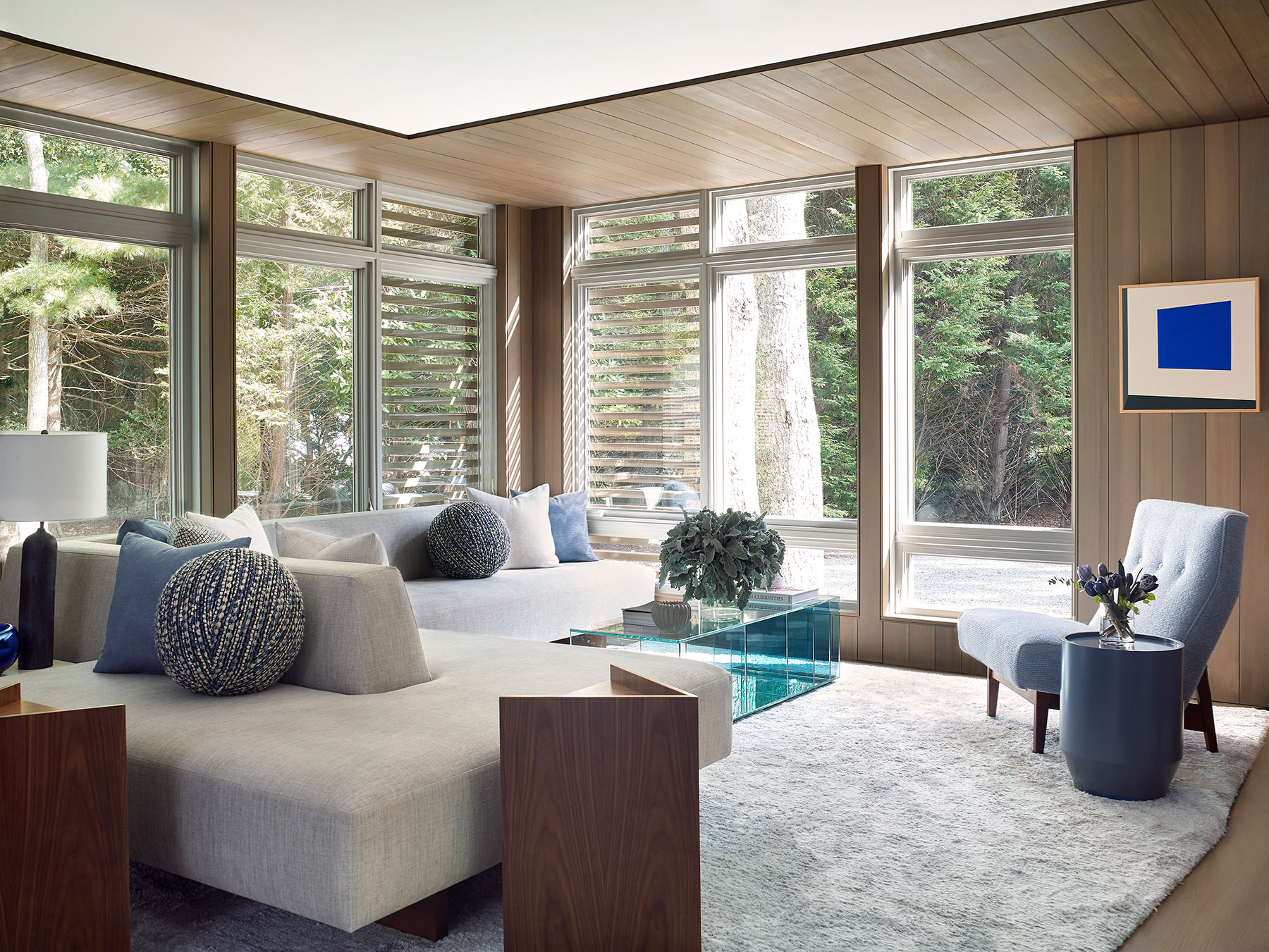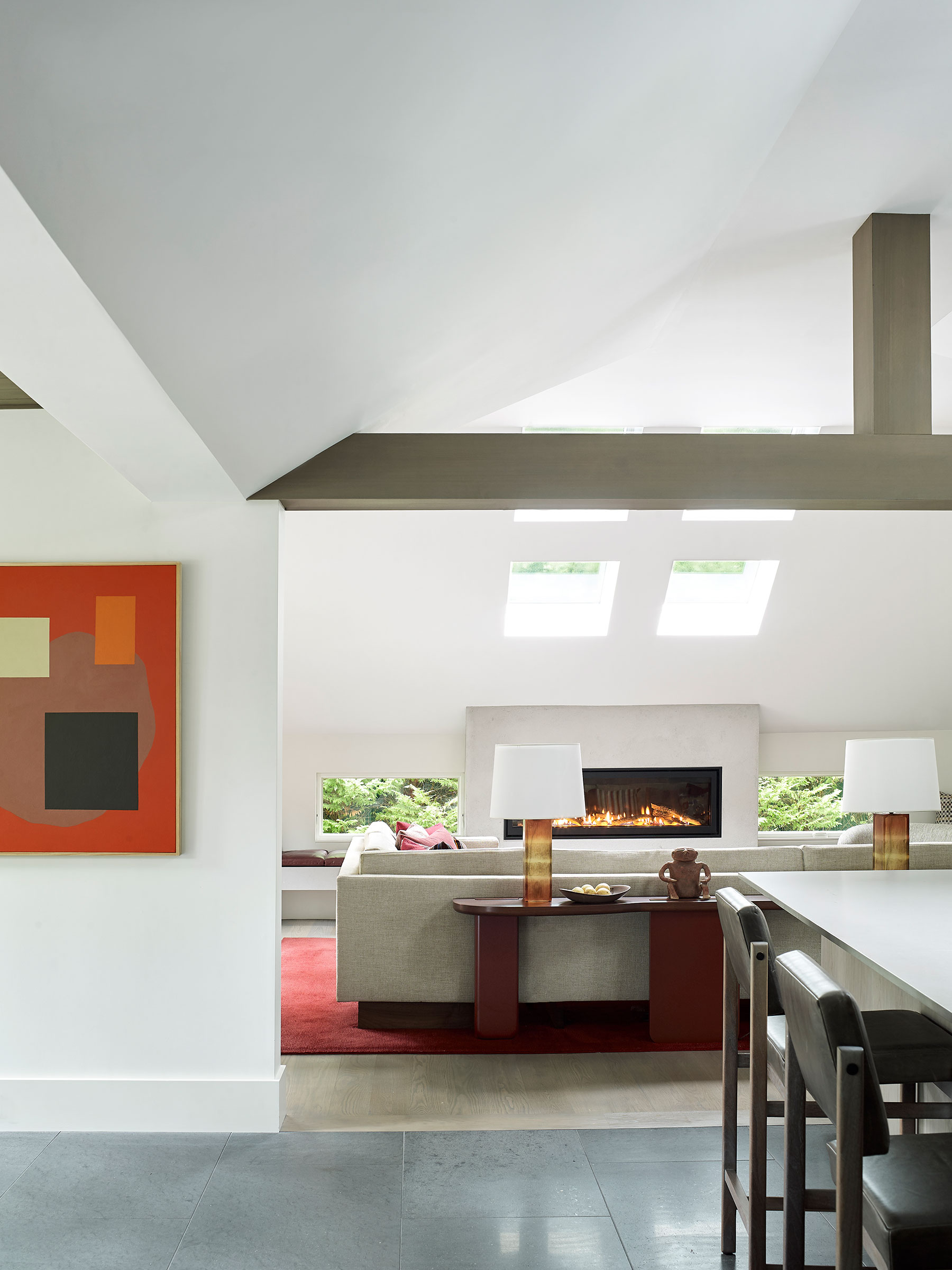 Our client's Hamptons home was taken down to the studs, reconfigured and expanded in a total transformation. We collaborated closely with the project architect to develop an interior that creates a unified composition the new architectural envelope. We introduced a language of geometric furniture forms that interplay with the volumes of the architectural spaces, and each room’s mood is set with its own distinct accent color juxtaposed with consistent palette of soft neutral woods, greys and whites throughout the home. This project was featured in The New York Times.