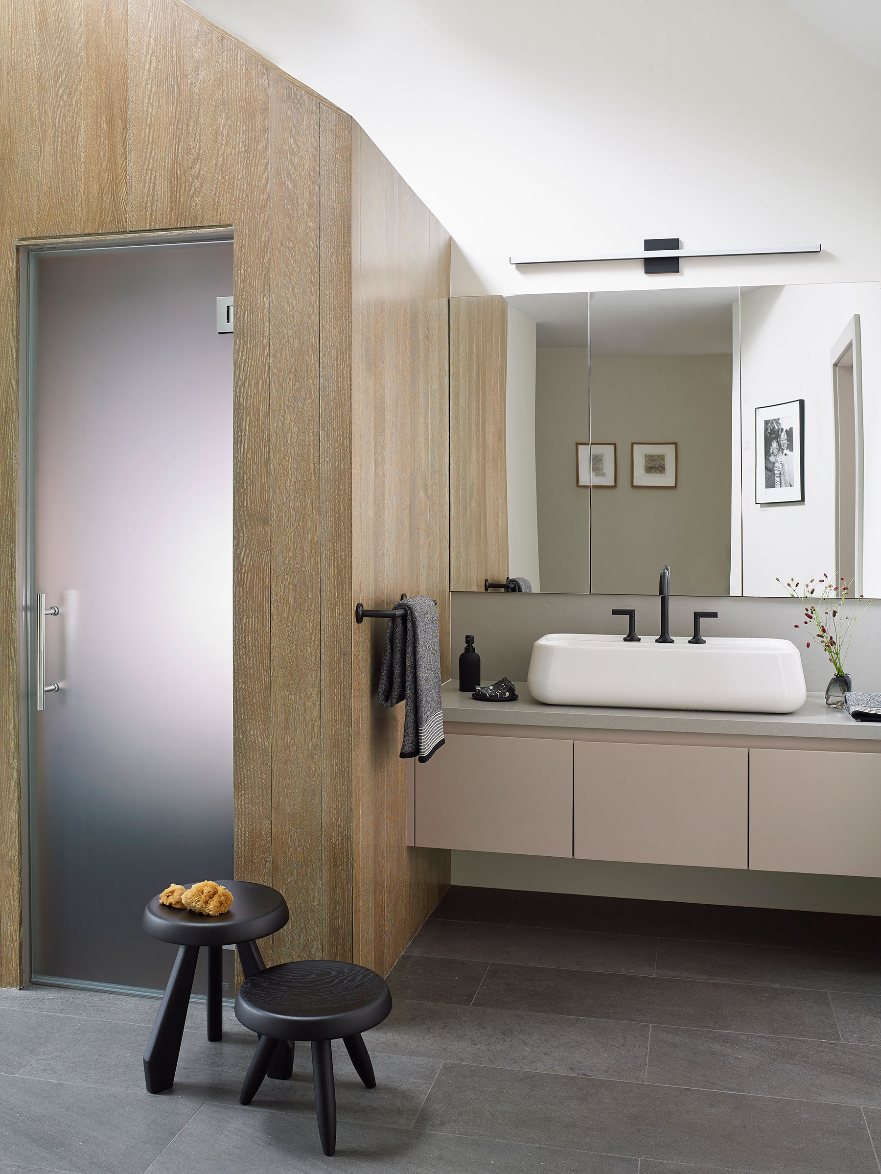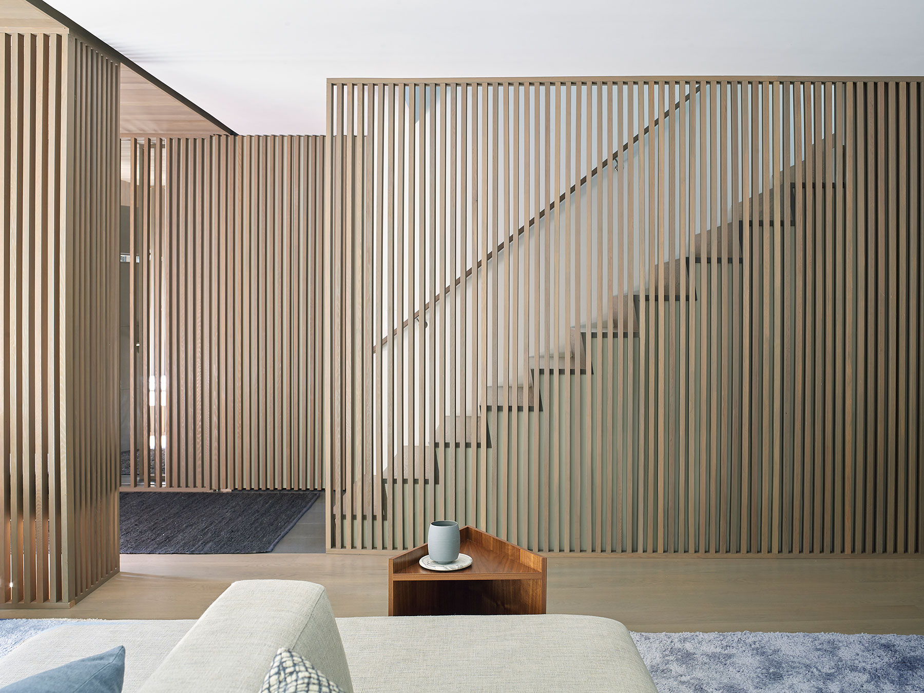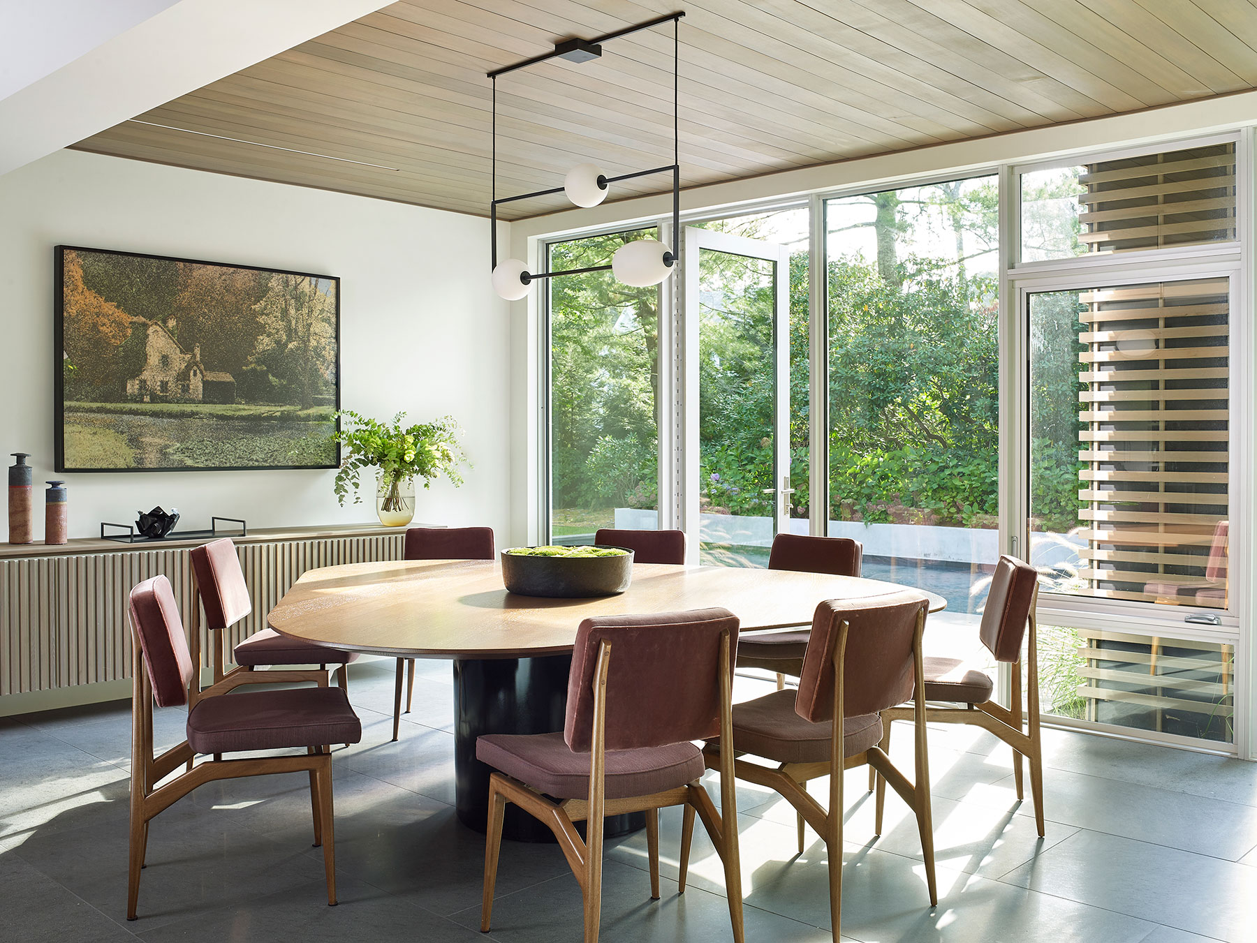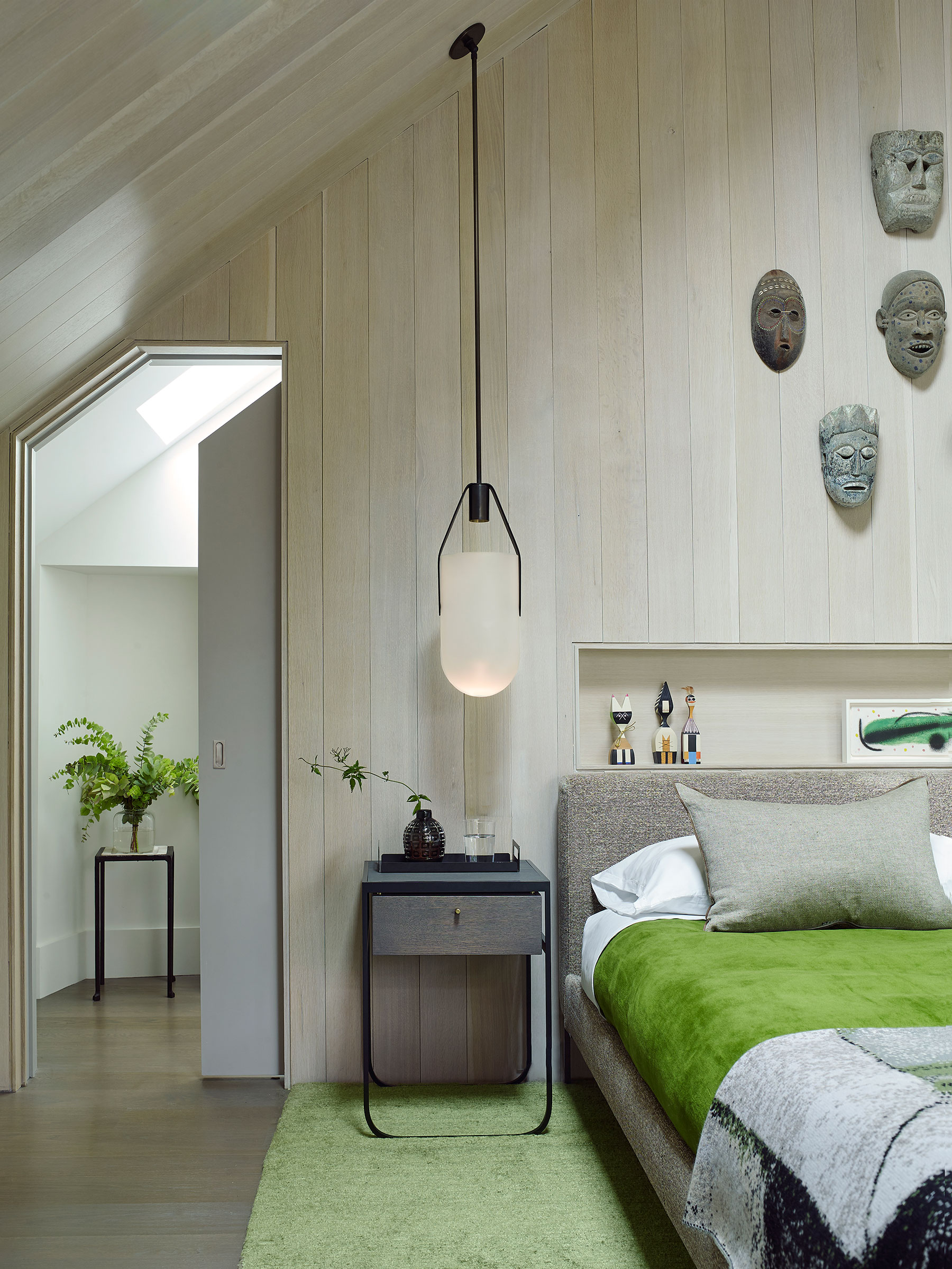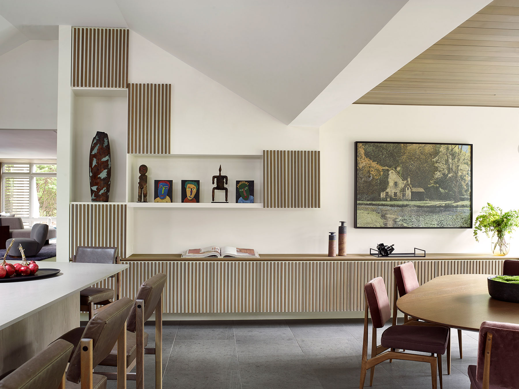 Our client's Hamptons home was taken down to the studs, reconfigured and expanded in a total transformation. We collaborated closely with the project architect to develop an interior that creates a unified composition the new architectural envelope. We introduced a language of geometric furniture forms that interplay with the volumes of the architectural spaces, and each room’s mood is set with its own distinct accent color juxtaposed with consistent palette of soft neutral woods, greys and whites throughout the home. This project was featured in The New York Times.