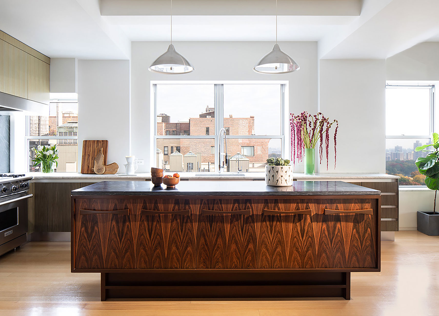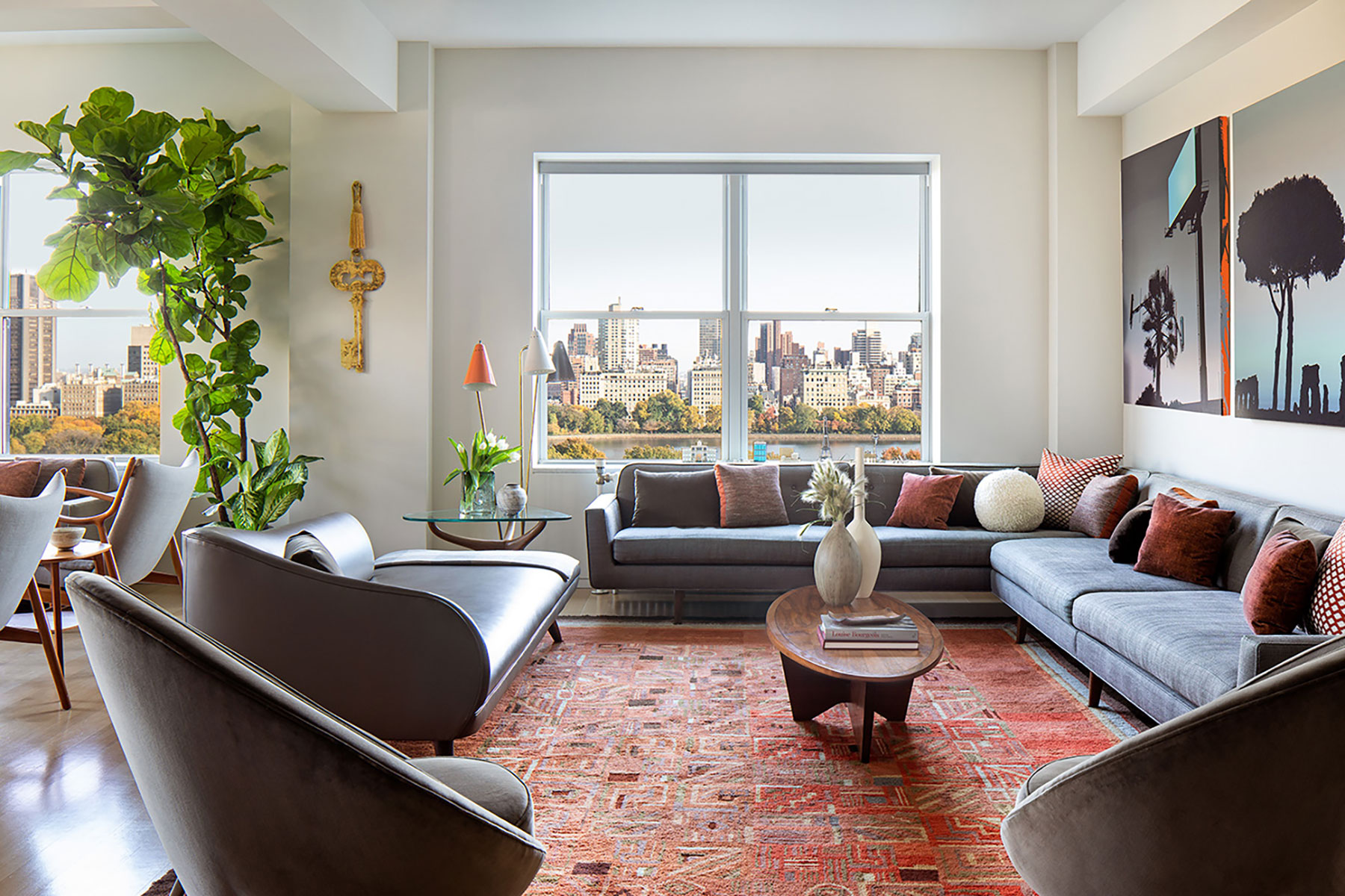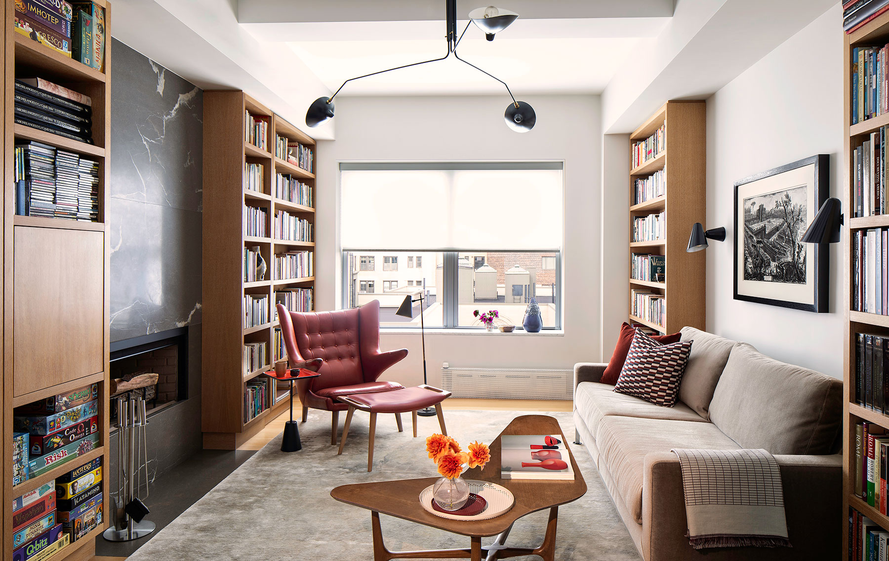 We collaborated tightly with our client who had a love and knowledge of midcentury furniture designers on this renovation and furnishing of a duplex apartment residence on Central Park West. Carefully curated vintage pieces combine with custom furnishings and millwork in the language of the midcentury masters. Some of our favorite designs include a rosewood kitchen island based on a midcentury Brazilian console, a chaise designed in collaboration with Vladimir Kagan studio and two extraordinary stone fireplaces.